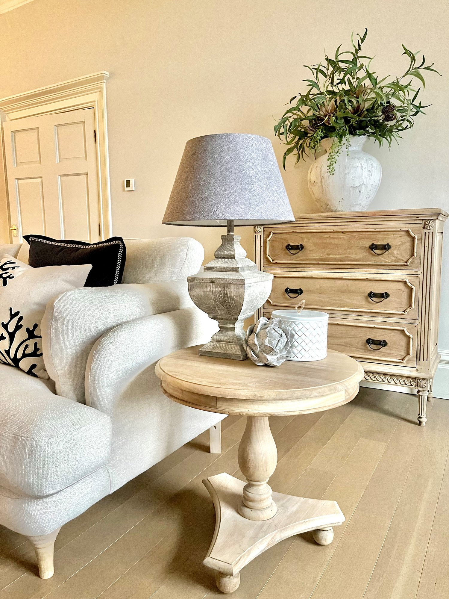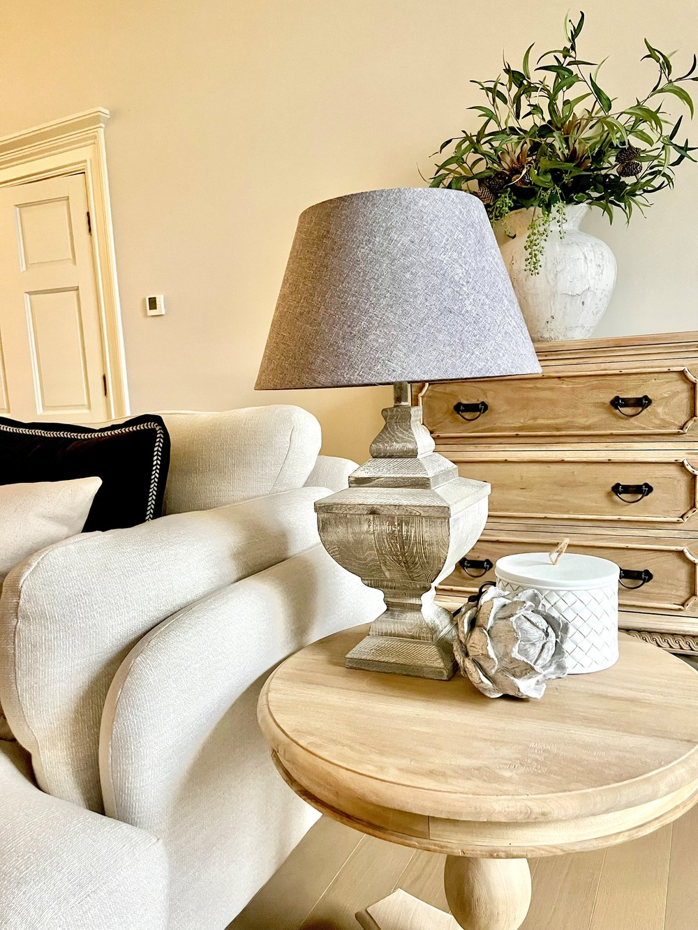 Another beautiful wooden based lamp for Spring / Summer 2023 is the Oatley Grey Wash Wooden Lamp. Made from sustainably sourced Fir wood, its solid wood base is slightly Urn like in shape with a textured Grey and white washed bleached finish. The lamp shade is mid grey and denimed, and perfectly compliments the base.