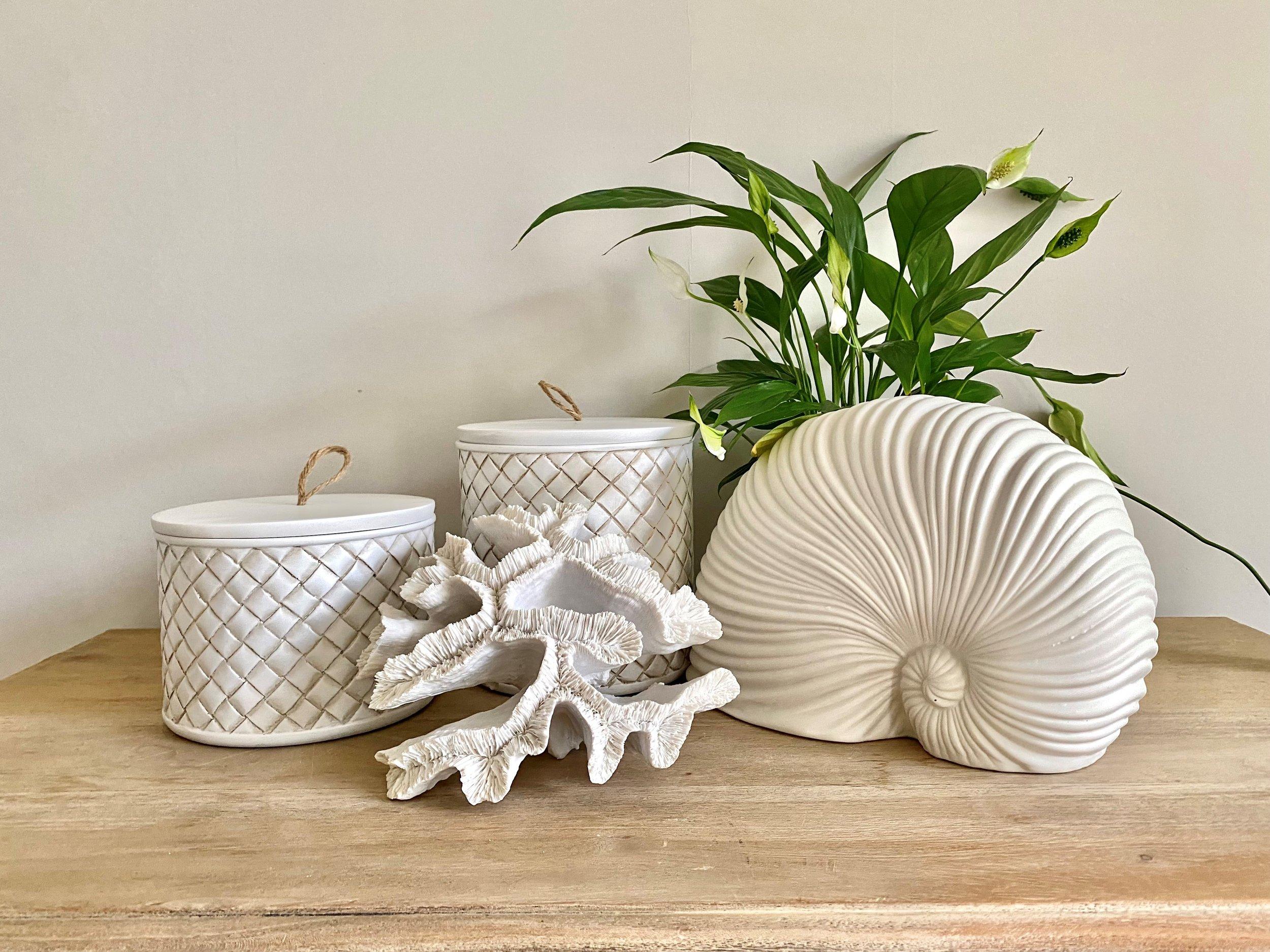 Our Avalon woven ceramic jars work beautifully as a pigeon pair. Perfect for a bathroom or kitchen area as they are easy clean - these little gems will add a touch of tropical charm, yet be very useful where ever you decide to pop them.