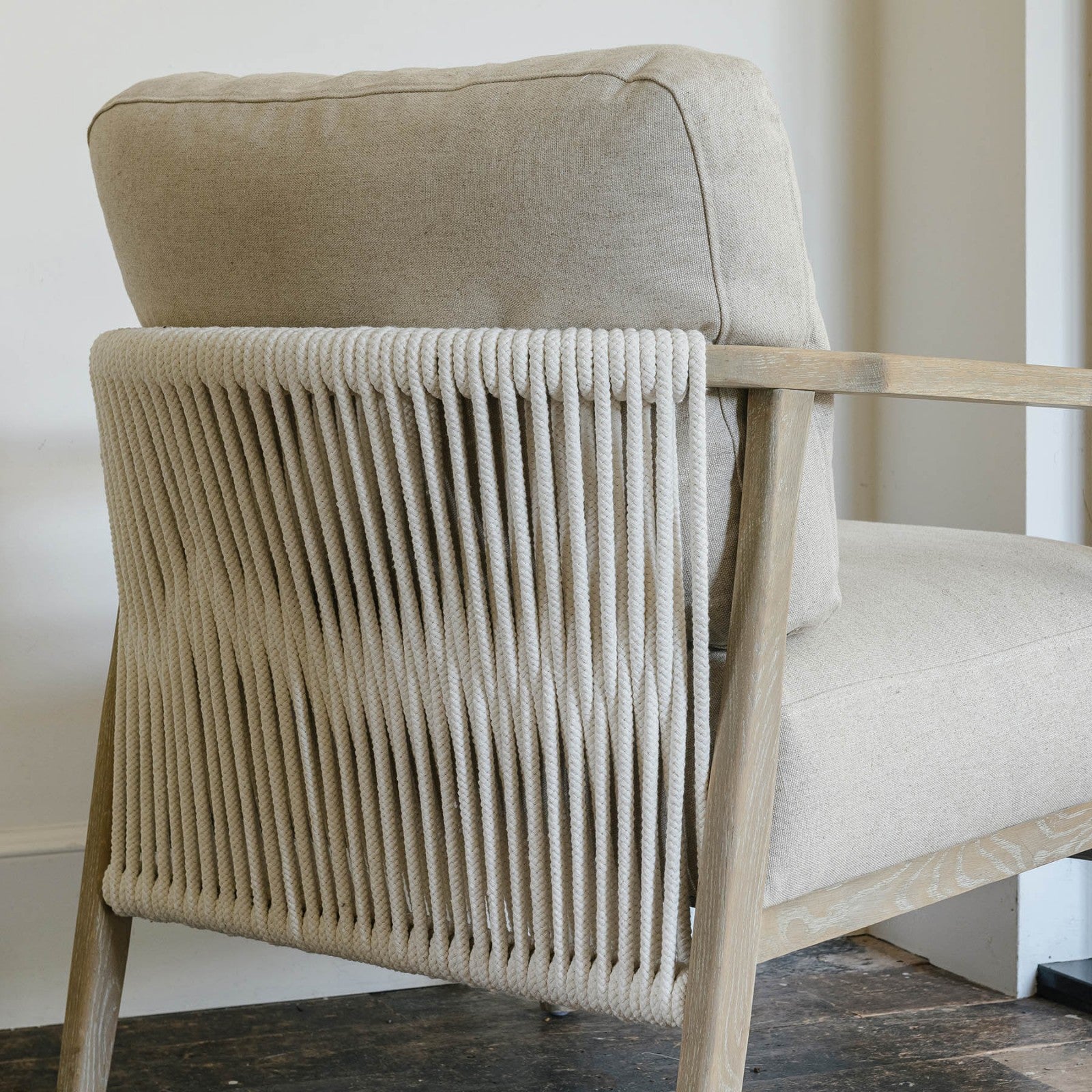 Kick back and relax in our gorgeous Bondi armchair. The unique rope design to the back of the chair, gives it a chilled out coastal vibe just like the beach to which it is named. The wood frame is mid century in design, in a solid white wash oak finish; upholstery is in natural linen.