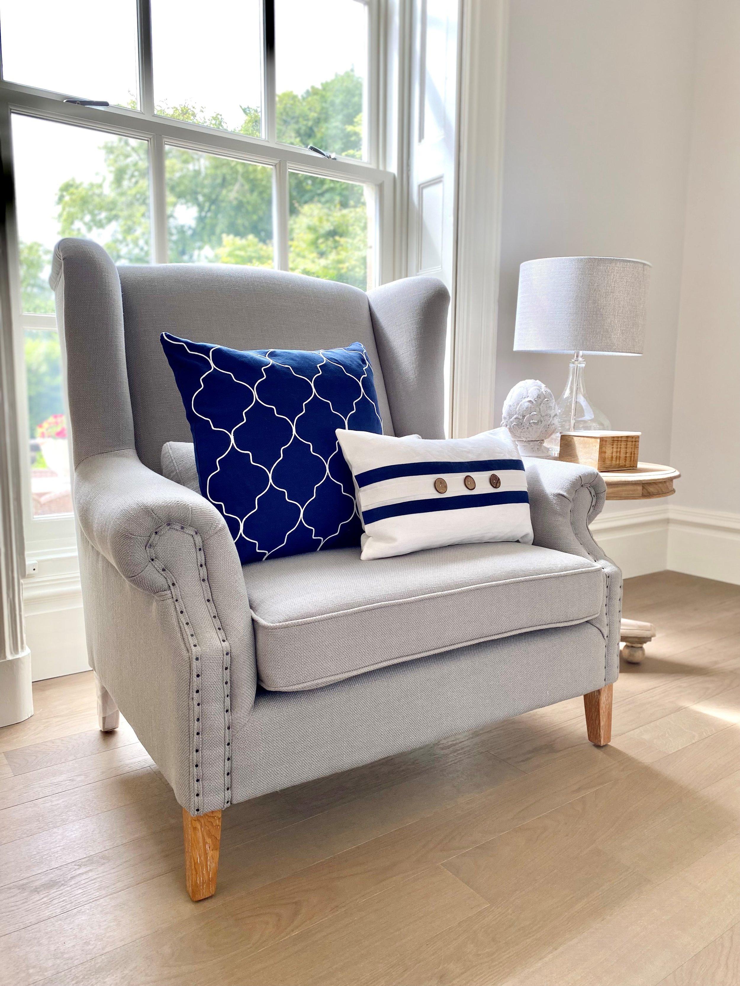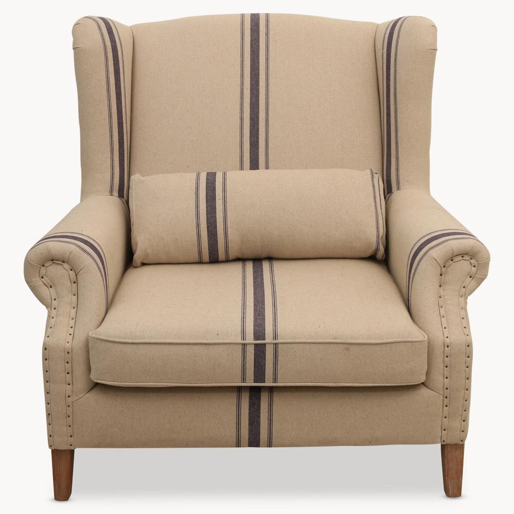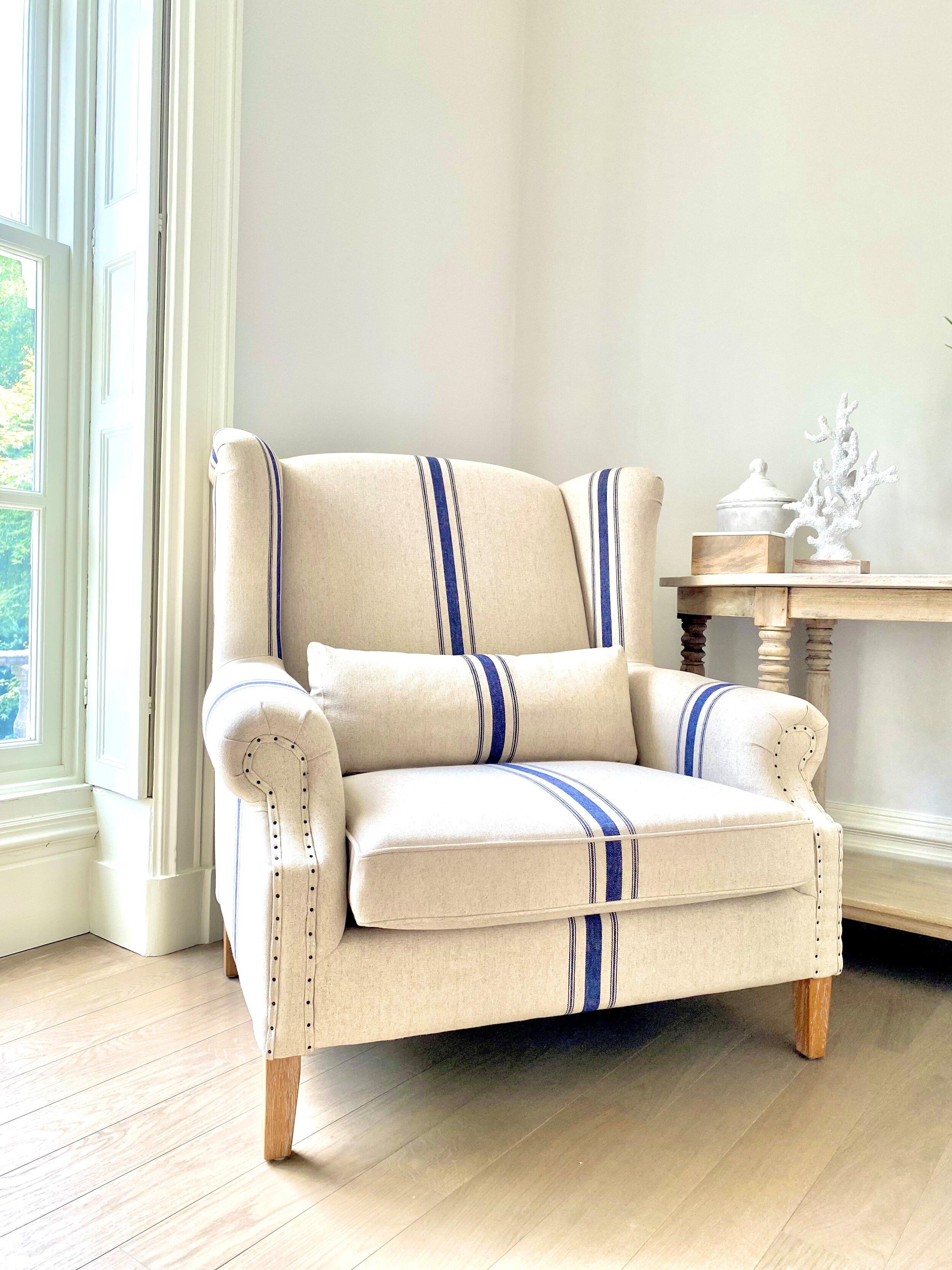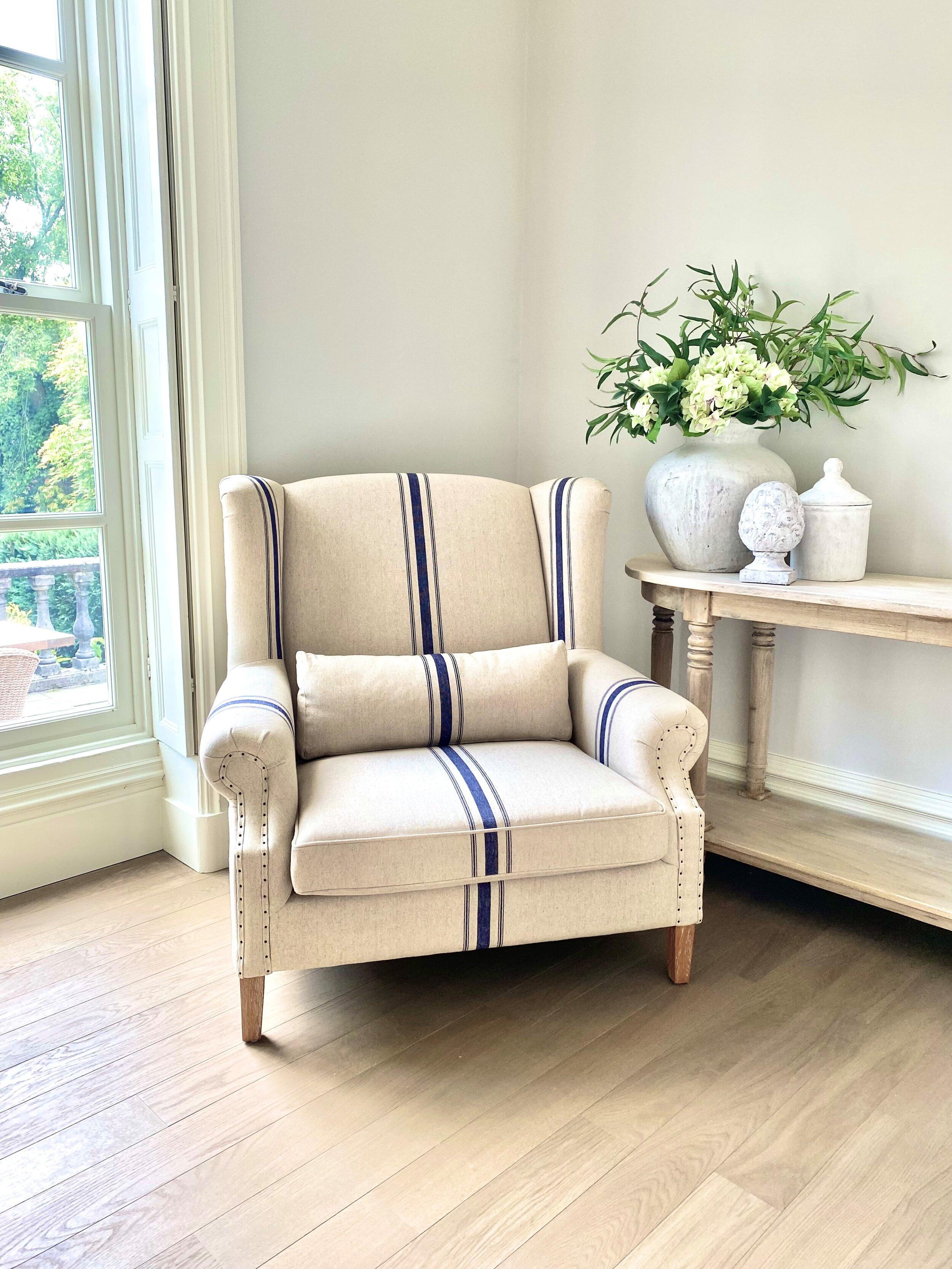 Only 4 Grey left in stock ! Our Mosman Linen Chair is a generously sized love seat, perfect for cosying up with a good book or to watch a favourite movie. With Oak legs and matching lumbar support cushion, finished in grey linen or cream and navy ticking stripe. It will look stylish in a study, lounge or bedroom.